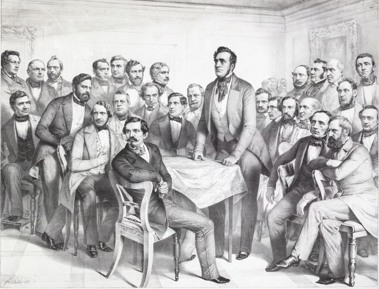 Zur Erinnerung an die verfassung gebende deutsche Reichsversammlung des Jahres 1848""DIeDiese Lithographie des Kurpfälzischen Museums trägt den Titel "Zur Erinnerung an die verfassung gebende deutsche Reichsversammlung des Jahres 1848". Das Blatt zeigt mittig stehend einen der bedeutendsten Politiker der 1848er Revolution, Heinrich von Gagern. Um ihn herum gruppiert sich die Fraktion "Club des Casino" in halber Stärke. Der Beitrag erläutert die Hintergründe.