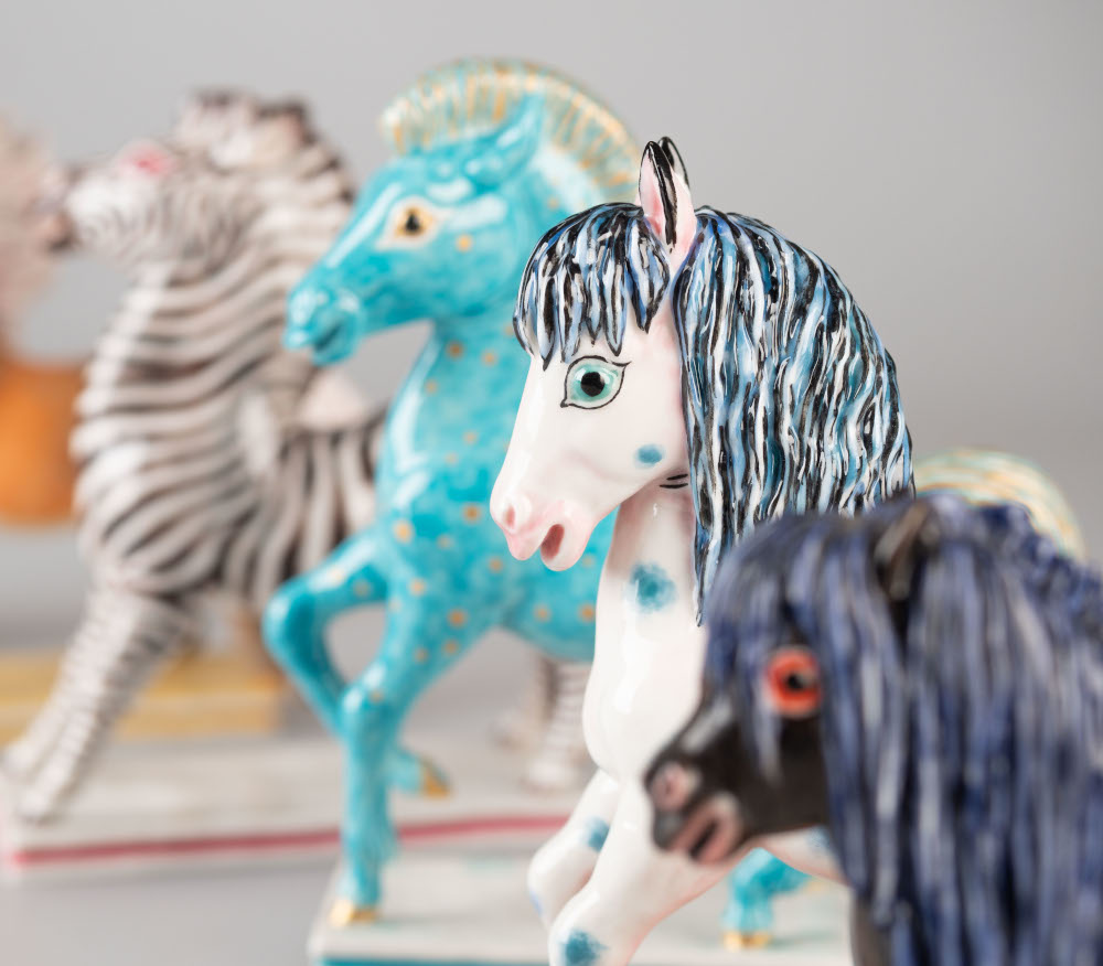Nach 1945 arbeitete die Nymphenburger Porzellanmanufaktur mit ausgewählten Kunstschaffenden zusammen, um individuelle und moderne Entwürfe zu erhalten. Zu diesem Kreis gehört auch auch Luise Terletzki-Scherf, die sich als Künstlerin auf Tiermotive spezialisiert hatte. Die Inspiration für die bunte Herde von Pferden, Ponys und Zebras fand sie vermutlich im Münchner Tierpark Hellabrunn. Die seltenen Sammlungsstücke sind aktuell in der Ausstellung „Heidelberg in den 50er Jahren“ zu sehen.